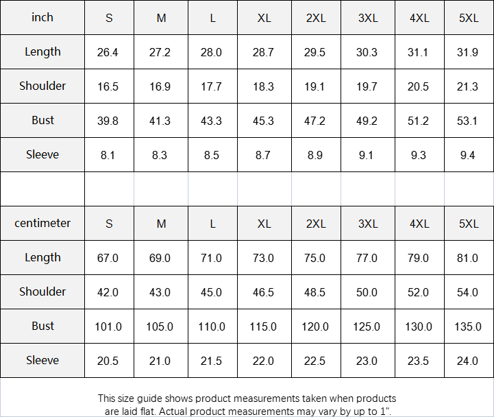 inch | S | M | L | XL | 2XL | 3XL | 4XL | 5XL |