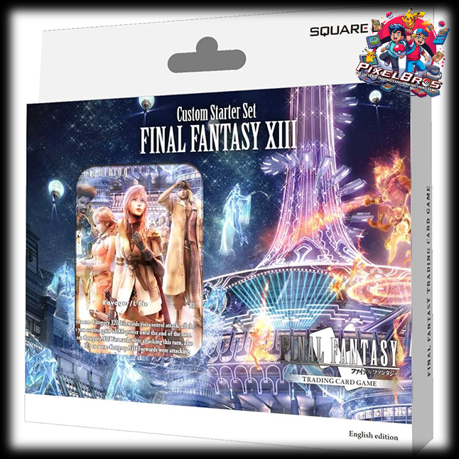 “Custom Starter Set FINAL FANTASY XIII” is the second release in the “Custom Starter Set” series, which includes one 50-card deck, along with 50 customization cards for players to experience the fun of customizing their own deck. By simply replacing the Fire or Lightning element cards within the Starter deck (24 Fire, 24 Lightning, 2 Light element cards), with the 24 Ice element cards included in the customization cards, you can easily transform the deck into a “Fire/Ice” deck or an “Ice/Lightning” deck. Also, there are 26 freely interchangeable cards, allowing players to create an original custom deck of their own. Unlike the “Two Player Starter Set”, the “Custom Starter Set” contains only 1 deck. However, it allows players to experience the fun of deck building for the first time, which can be a hurdle for many beginners. Among the 100 cards included in the deck and customization cards, there are 30 total new Starter cards (3 cards each of 10 different cards). For the Starter card Lightning [19-138S], one of the cards will be a Full Art Premium Foil card. Also, one of the reprinted cards, Lightning [13-081H], will be a Full Art Standard (non-Foil) card. Contents: Preconstructed Deck: 50 cards Cards for Customization: 50 cards Quick Start Guide: 1 Deck Customization Guide: 1