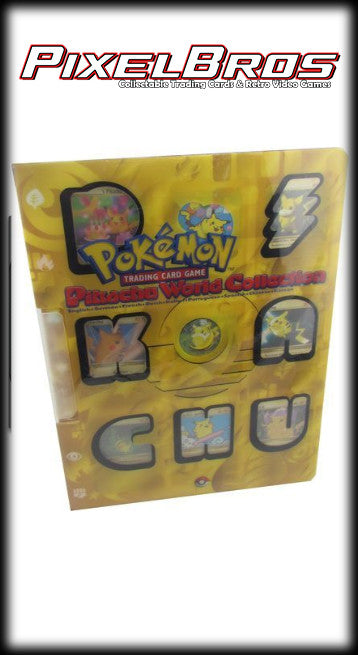 Pokemon 2000 Pikachu World Collection 9 card Olympic card binder. It was only sold at the 2000 Sydney Summer Olympics in Sydney, Australia. It has reproductions of the most famous Pikachu cards, all printed in 9 different languages for the spirit of the Olympic games. Out of production. Here is what the binder contains: