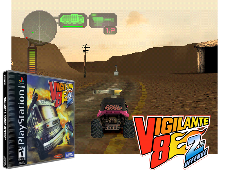 *Vigilante 8: 2nd Offense* is a vehicular combat game filled with high-speed battles, explosive weapons, and destructible environments. Choose from a roster of insane vehicles, take down enemies, and unleash chaos in this classic PS1 action title.
