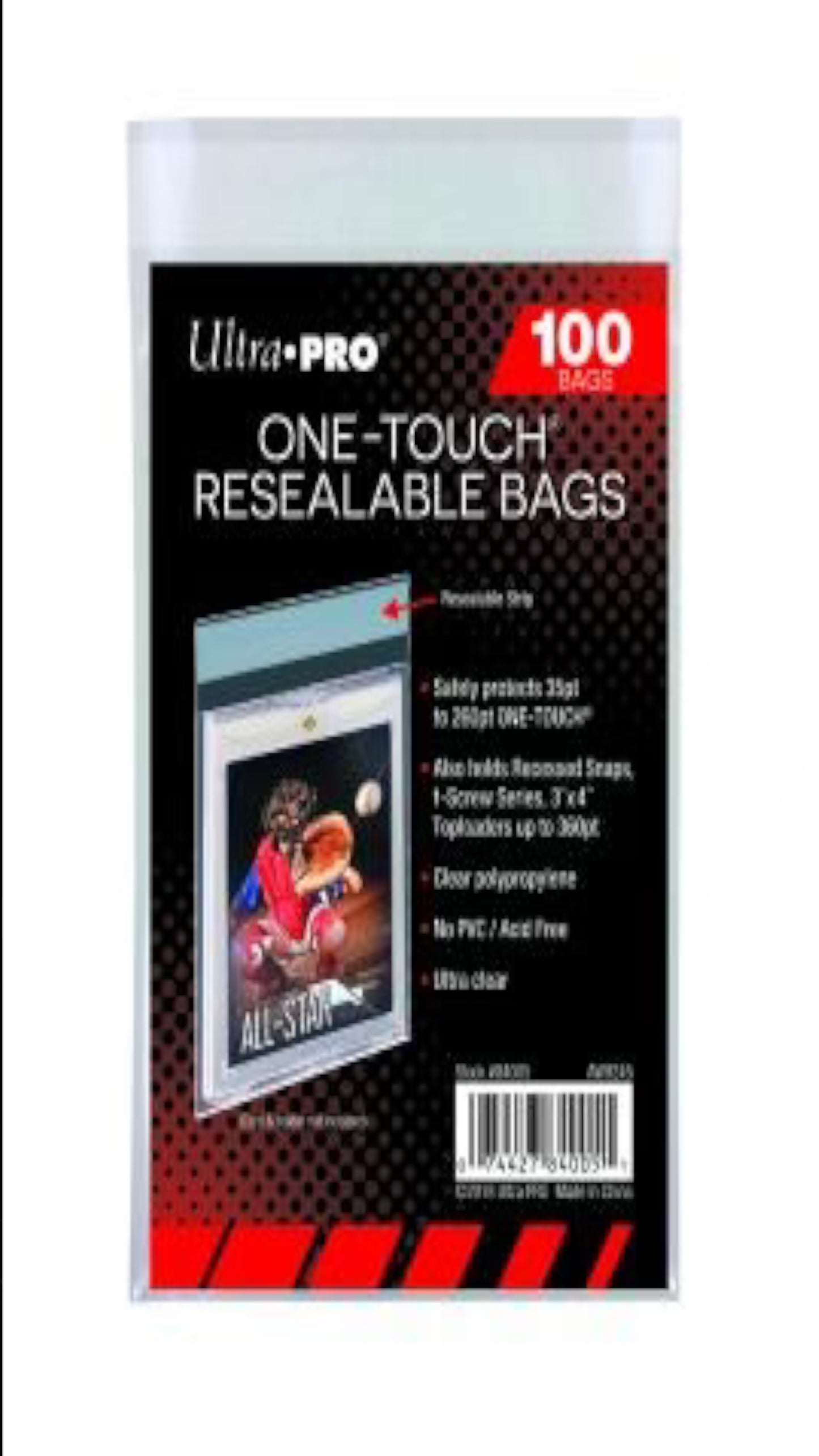 Ultra clear, archival-grade and resealable bags designed to hold up to 260pt thickness ONE-TOUCH holders. Keep your ONE-TOUCH holder pristine, protect it from scratches, and keep it intact during transport. These clear resealable bags also hold Ultra PRO's recessed snaps, 1-screw series, and up to 180pt 3" X 4" Toploaders. Each pack contains 100 individual bags, with each bag measuring approximately 3-1/4" x 4-3/4".
